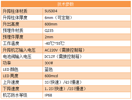 • 升降柱體采用304不銹鋼材質,抗生銹、耐腐蝕