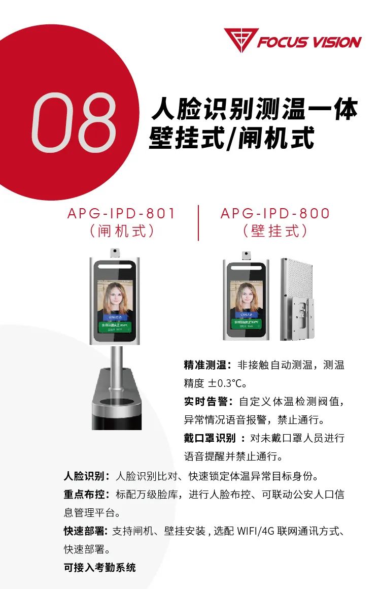 性價比高,精準高效測溫的同時,可接入考勤系統(tǒng),通過人臉識別,對學生遲到、缺勤等情況進行監(jiān)督,并可配合閘機實現體溫檢測和人員進出聯(lián)動,閘機可為體溫正常人員自動開閘。