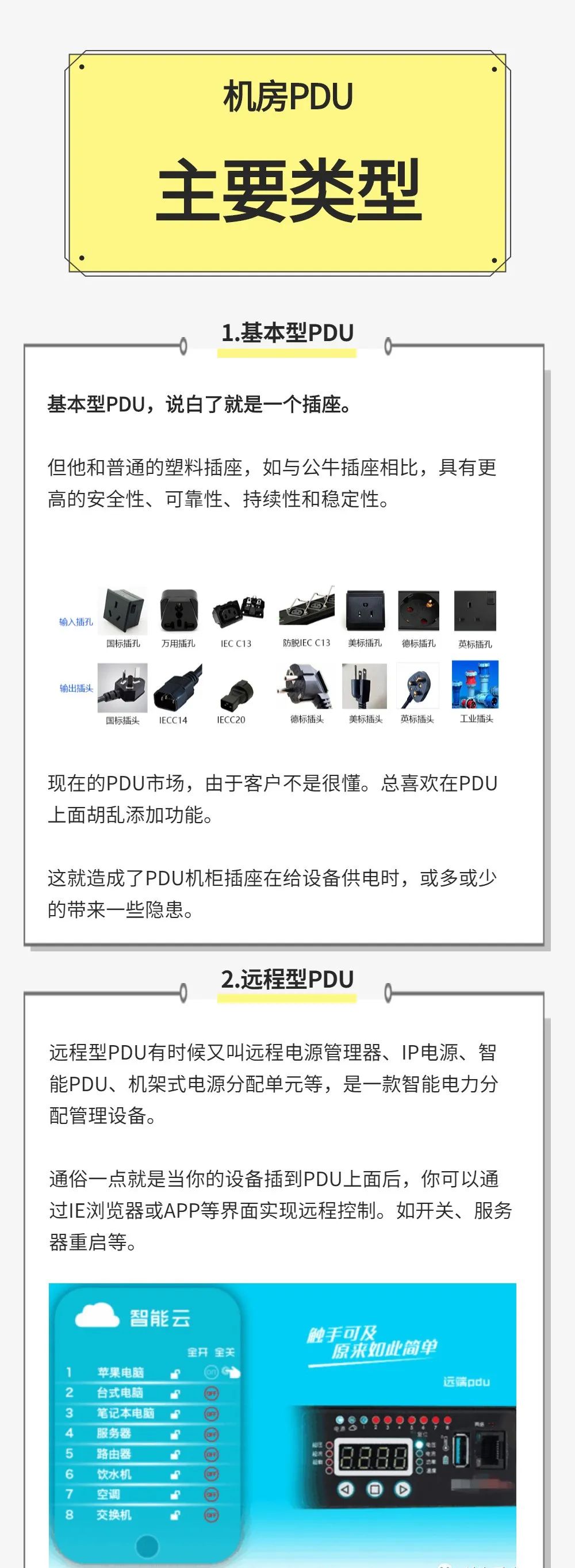 綜上所述,作為機柜專用電源插座的PDU不但有基本型和遠程型之分,而且相對于普通插座具有安全質(zhì)量好、承載功率大、插座制式種類多、保護功能齊全、控制功能靈活、使用方便等多方面的優(yōu)點。