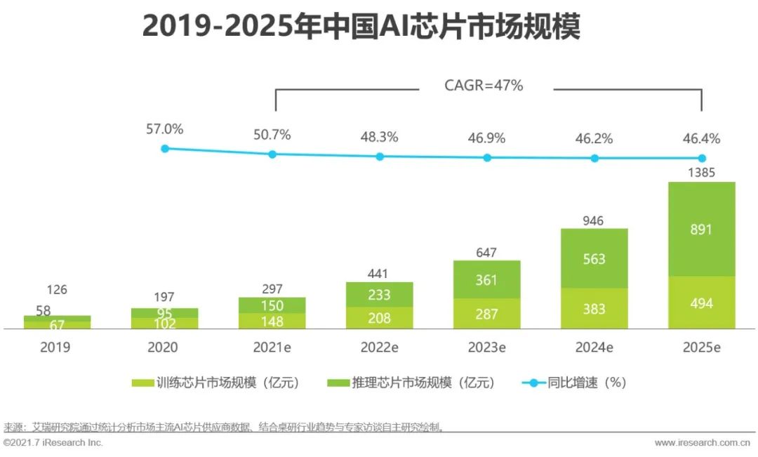 AI芯片是人工智能產(chǎn)業(yè)的關(guān)鍵硬件,也是AI加速服務器中用于AI訓練與推理的核心計算硬件,被廣泛應用于人工智能、云計算、數(shù)據(jù)中心、邊緣計算、移動終端等領(lǐng)域。當前,我國的AI芯片行業(yè)仍處于起步期,市場空間有待探索與開拓。據(jù)艾瑞統(tǒng)計與預測,2020年我國AI芯片市場規(guī)模為197億元,到2025年,我國AI芯片市場規(guī)模將達到1385億元,2021-2025年的相關(guān)CAGR=47%,市場整體增速較快。從AI芯片的計算功能來看,一開始,因AI應用模型首先要在云端經(jīng)過訓練、調(diào)優(yōu)與測試,計算的數(shù)據(jù)量與執(zhí)行的任務量數(shù)以萬計,故云端訓練需求是AI芯片市場的主流需求。而在后期,訓練好的AI應用模型轉(zhuǎn)移到端側(cè),結(jié)合實時數(shù)據(jù)進行推理運算、釋放AI功能,推理需求逐漸取代訓練需求,帶動推理芯片市場崛起。2025年,云端推理與端側(cè)推理成為市場規(guī)模增長的主要拉動力,提升了逐漸下滑的AI芯片市場規(guī)模同比增速。