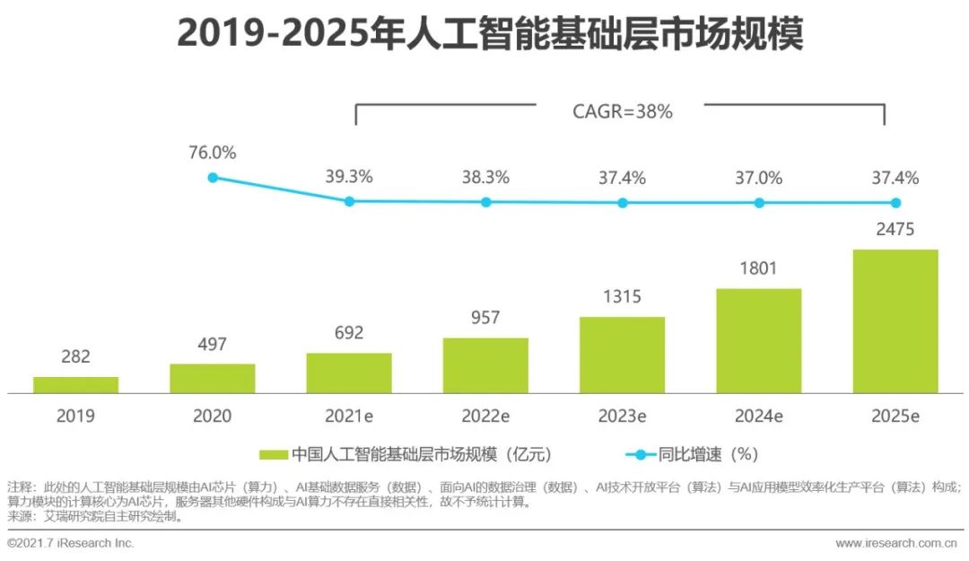 AI企業(yè)突破業(yè)務增長瓶頸的需求是人工智能基礎(chǔ)層發(fā)展的驅(qū)動力之一。當前人工智能核心產(chǎn)業(yè)規(guī)模保持線性增長態(tài)勢,且增速趨于平穩(wěn)與常態(tài)化。為尋求產(chǎn)值增長突破點,AI企業(yè)發(fā)力探索開拓市場的有效手段。依托人工智能基礎(chǔ)層資源建設(shè),AI企業(yè)可有效應對下游客戶的長尾應用需求,再將高頻應用轉(zhuǎn)化為新主營業(yè)務。此外“新基建”、半導體自主可控等相關(guān)政策扶持、傳統(tǒng)行業(yè)智能化轉(zhuǎn)型等因素也都在助推人工智能基礎(chǔ)層資源的發(fā)展。據(jù)艾瑞測算,2021-2025年,人工智能基礎(chǔ)層市場規(guī)模CAGR為38%,整體產(chǎn)業(yè)規(guī)模發(fā)展速度較快、空間較為廣闊,總體呈現(xiàn)持續(xù)增長的走勢。2020年,中國人工智能基礎(chǔ)層市場規(guī)模為497億元,為人工智能產(chǎn)業(yè)總規(guī)模的33%,市場規(guī)模相較去年同比增長76%,AI應用模型效率化生產(chǎn)平臺創(chuàng)收增長、AI芯片市場規(guī)模隨著云端訓練需求出現(xiàn)較高增長等是同比增速的主要拉動力;2021-2024年同比增速趨于平緩下降,市場開始恢復穩(wěn)步增長態(tài)勢。到2025年,中國人工智能基礎(chǔ)層市場規(guī)模將達到2475億元,云端推理與端側(cè)推理芯片市場持續(xù)走高使得人工智能基礎(chǔ)層整體市場同比增速稍有抬升。