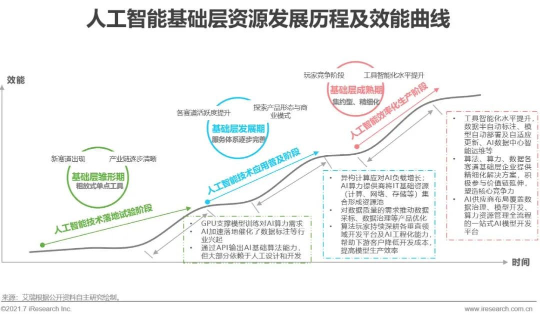 智能化轉(zhuǎn)型趨勢下,企業(yè)部署AI項目的需求正經(jīng)歷著變化,對數(shù)據(jù)質(zhì)量、模型生產(chǎn)周期、模型自學習水平、模型可解釋性、云邊端多樣部署方式、人力成本及資金投入、投資回報率等的要求都逐步走高。在上述需求特點及自動機器學習、AI芯片硬件架構(gòu)等技術(shù)發(fā)展的共同推動下,AI基礎(chǔ)層資源的整體效能水平也在不斷進化,以有效降低需求企業(yè)的AI開發(fā)成本。大致涵蓋相互交融的三個階段:雛形期,算法/算力/數(shù)據(jù)各模塊多為粗放式的單點工具,新興產(chǎn)品及賽道逐步出現(xiàn);快速發(fā)展期,各賽道活躍度顯著提升,參與者積極探索產(chǎn)品形態(tài)與商業(yè)模式,基礎(chǔ)層服務體系逐步完善、資源價值凸顯;最后則向成熟階段過渡,各賽道內(nèi)企業(yè)競爭加劇,逐步跑出頭部企業(yè)。同時各賽道間企業(yè)生態(tài)合作增多,一站式工具平臺出現(xiàn)。