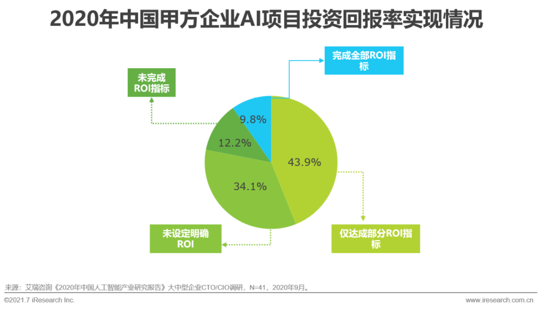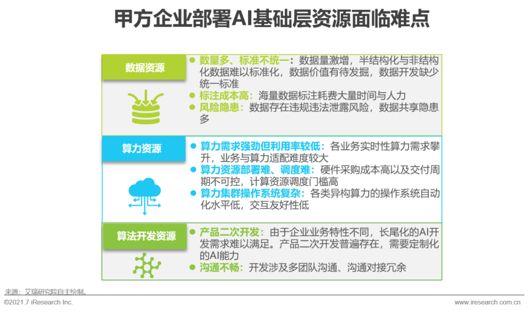 根據(jù)艾瑞2020年執(zhí)行的CTO調(diào)研,2019年超過51%的樣本企業(yè)AI相關(guān)研發(fā)費用占總研發(fā)費用比重在10%以上,2020年65.9%的企業(yè)AI研發(fā)占比達到10%以上。一方面是甲方企業(yè)不斷增長的對智能化轉(zhuǎn)型的強勁需求,一方面則是在AI應用開發(fā)與部署過程中企業(yè)普遍面臨的數(shù)據(jù)質(zhì)量(49%)、技術(shù)人才(51%)等基礎(chǔ)資源配置難點。且目前只有少數(shù)企業(yè)可以完成AI項目實施前設(shè)定的全部投資回報率(ROI)標準,因此甲方企業(yè)在投資AI項目時相對審慎。AI基礎(chǔ)層資源則可有效緩解甲方利用AI技術(shù)重塑自身業(yè)務時的投資矛盾,提升模型生產(chǎn)效率,降低部署成本:數(shù)據(jù)資源集群具備數(shù)據(jù)采標與數(shù)據(jù)治理能力,且一站式的數(shù)據(jù)平臺可對實時數(shù)據(jù)進行統(tǒng)一管理,提高數(shù)據(jù)利用率;高效的AI算力集群與調(diào)度系統(tǒng)可滿足模型訓練與推理需求,降低總擁有成本(TCO,TotalCost of Ownership);基于算法開發(fā)平臺演化出的語音識別、計算機視覺、機器學習等專業(yè)的AI模型生產(chǎn)平臺,可提供高效、一站式的AI模型生產(chǎn)服務。
