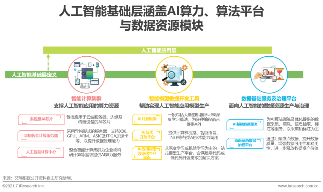 算力、算法、數(shù)據(jù)是人工智能產(chǎn)業(yè)發(fā)展的三大要素。據(jù)此,人工智能基礎(chǔ)層主要包括智能計算集群、智能模型敏捷開發(fā)工具、數(shù)據(jù)基礎(chǔ)服務與治理平臺三個模塊。智能計算集群提供支撐AI模型開發(fā)、訓練或推理的算力資源,包括系統(tǒng)級AI芯片和異構(gòu)智能計算服務器,以及下游的人工智能計算中心等;智能模型敏捷開發(fā)工具模塊主要實現(xiàn)AI應用模型的生產(chǎn),包括開源算法框架,提供語音、圖像等AI技術(shù)能力調(diào)用的AI開放平臺和AI應用模型效率化生產(chǎn)平臺;數(shù)據(jù)基礎(chǔ)服務與治理平臺模塊則實現(xiàn)AI應用所需的數(shù)據(jù)資源生產(chǎn)與治理,提供AI基礎(chǔ)數(shù)據(jù)服務及面向AI的數(shù)據(jù)治理平臺。AI基礎(chǔ)層企業(yè)通過提供AI算力、開發(fā)工具或數(shù)據(jù)資源助力人工智能應用在各行業(yè)領(lǐng)域、各應用場景落地,支撐人工智能產(chǎn)業(yè)健康穩(wěn)定發(fā)展。